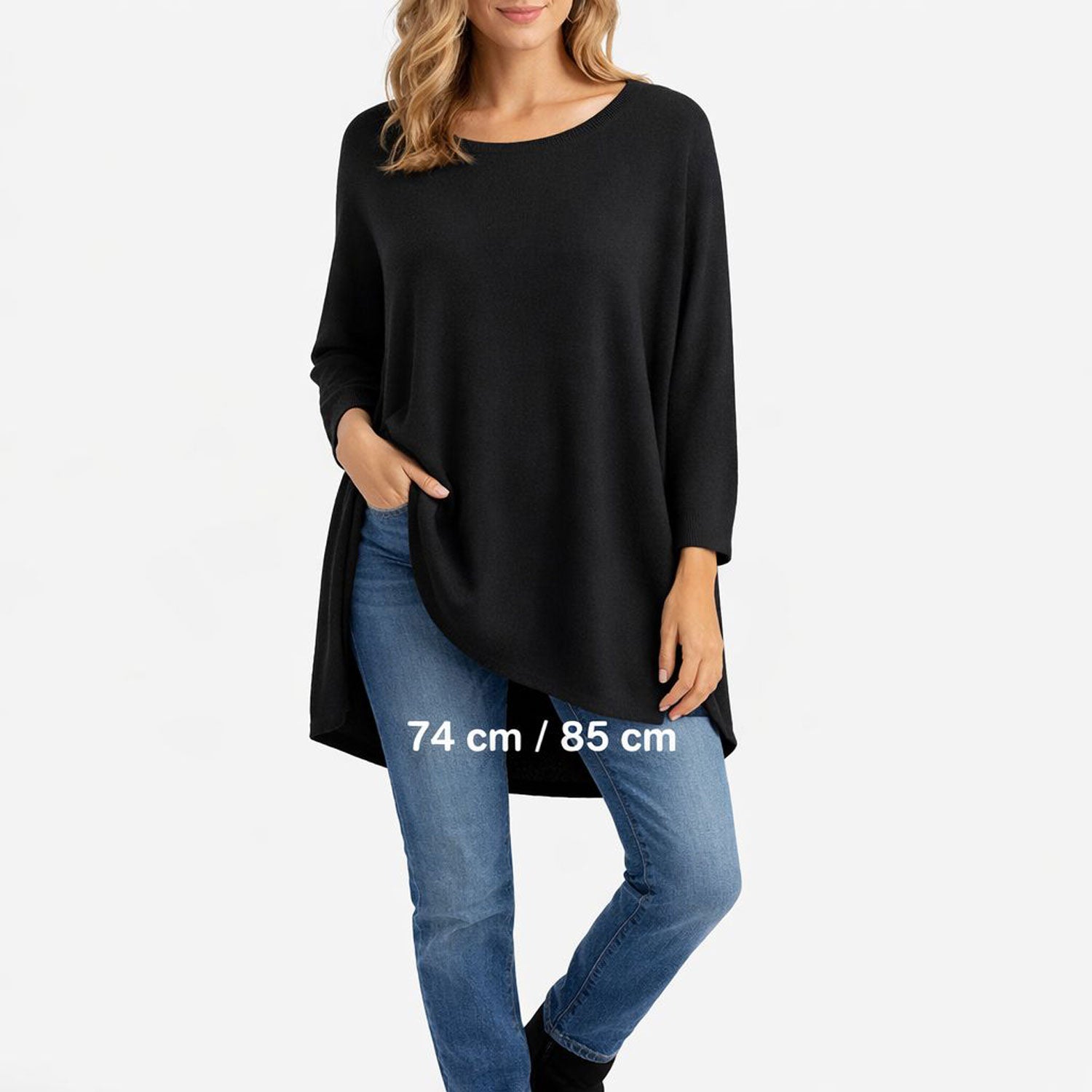 Der Oversize-Schnitt bietet viel Bewegungsfreiheit und ist tragbar bis Größe 50 / 52. Ideal für alle, die bequemen Style mit Eleganz verbinden möchten.